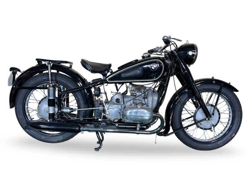 An important step forward in the development of BMW's long-running flat-twin occurred in 1936 with the introduction of the 494cc R5. Prior to that the BMW engine had been recognisably related to the first of its type, the 1923 R32, and like those of its (500cc) predecessors, the R5's engine dimensions were 'square' at 68x68mm bore/ stroke. However, the overhead-valve R5 engine broke new ground by adopting two chain-driven camshafts, a move that permitted shorter pushrods and higher revs. Maximum power increased to 24bhp at 5, 800rpm. Top speed was an impressive 140km/ h (87mph). In 1938 this flagship model was up-dated as the R51, gaining a telescopic front fork and plunger rear suspension, and continued in production until 1940, by which time 3, 775 of these exciting sports roadsters had been sold, many bought by German police forces. The R51 was one of the most coveted sports roadsters of its era and today is highly sought after by collectors.