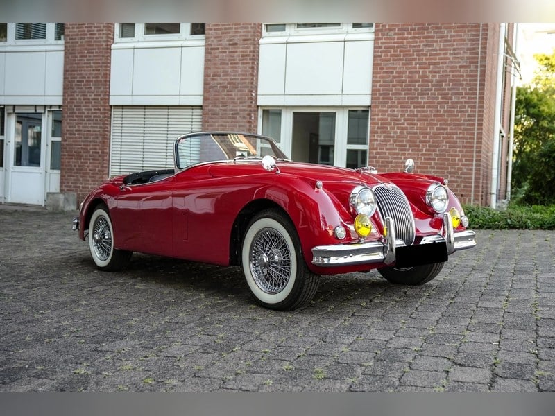 Zum Verkauf steht ein Jaguar XK 150 OTS aus dem Jahr 1958 in der Farbe Carmen-Red und einer Innenausstattung aus schwarzem Leder.