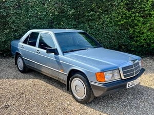JG Classic and Performance är stolta över att presentera Monty, vår 1987 Mercedes 190E 2. 0 Automat, färdig i Diamond blue över blått tyginteriör. Vi tror att den levererades ny av Woking Motors i Walton On Thames den 4 augusti 1987. Monty är ett fantastiskt exempel som gått endast 43 374 mil från ny och har endast 4 ägare. Den har också över 25 tidigare MOT-tester som backar upp all information om bilen, vilket få av dessa fordon har. Jag tycker personligen att färgkombinationen är den bästa. Diamond blue metallic ser glansig och korrekt ut, men åldersrelaterade märken visar hur ärlig och rak den här bilen är. Det blå tyginteriören visar också mycket lite slitage, med original-Mercedes-mattan fortfarande närvarande och instrumentpanelen är hel utan sprickor, även om några hårda plastlister börjar bli spröda här och där. Första hjälpen-kit hittar man fortfarande i bakre vagnarhyllan likt varningstriangel och verktygssatsen i bagageutrymmet. En annan trevlig detalj är bilens originalhandlarens nyckelringar och Mercedes-färgpenna som fortfarande ligger kvar i bilen. 2. 0 Auto är mjuk, bekväm och finjusterad, vilket får Merc att kännas som en relativt ny bil. Servosystemet är lätt att styra och det elektriska soltaket är perfekt för soliga klassiska biläventyr. Verkligen en bil som man verkligen kan köra länge – med tanke på miltal, tillstånd och den ökända tillförlitligheten hos dessa 190E:er råder inget tvivel om att bilen kan hålla i ytterligare hundra år om bensin finns tillgänglig. Snart också befriad från besiktning och fordonsskatt innebär detta en trevlig besparing kommande år. Överlag en mycket prydlig, ärlig, pålitlig och helt användbar klassisk bil som är förfinad och bekväm och kräver lite underhåll. Den perfekta starterklassikern eller entusiastens motorbil. Visning endast efter överenskommelse.