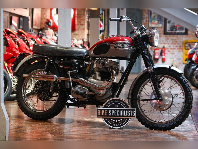 Här erbjuds till försäljning vår Triumph T110 som har renoverats och subtilt uppgraderats för att ge den utseendet av en klassisk Desert Sled. Registreringsnummer "526 PTF" T110 köptes av en vän till Triumph-gurun Andy Hesketh i mars 2016 i dess originalskick. Det var alltid avsikten från den nya ägaren att förvandla den till en "desert sled" som den ser ut idag. Andy byggde flera Triumph Cubs åt ägaren till en mycket hög standard. Han var högt respekterad i pre-65-trialsvärlden och var alltid i ständig efterfrågan. Han satte ett aluminiumframnav på och tillverkade en touring-bränseltank med ett bärrack. Den levereras tillsammans med V5-dokumentet och den medföljande originalloggboken. Cykeln skulle inte bara passa i en samling utan också vara en fantastisk motorcykel att ta ut på en söndagsmorgonstur.