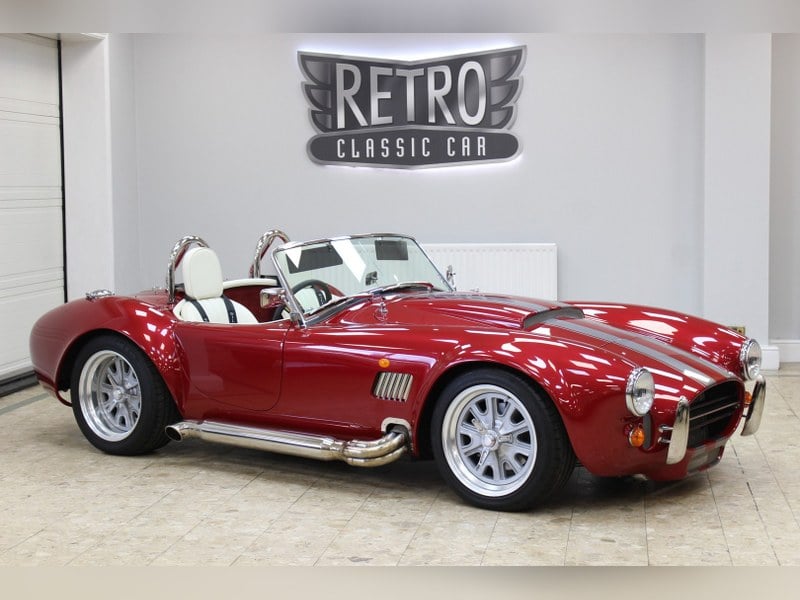 A newly completed example of the Dax Cobra, finished in metallic Ruby Red with painted silver stripes and complemented by a cream interior and stainless-steel side-pipes. Built to a high standard, this car offers a well-balanced combination of classic styling and modern engineering.