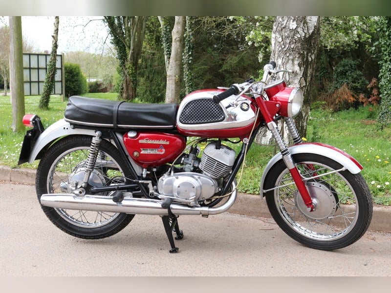 Fresh into stock a 1968 Suzuki Super 6 T20 Hustler. Original engine and frame combination. The bike had been standing for a couple of years. We put fuel in it, hooked up a jump battery and it ran nice, until the excessive fuel in the sump of number 2 cylinder, went up the transfer ports and hydraulically locked the piston and bent the con-rod! So will pulled the top end off to confirm. So this is what is required to fix it, a full gasket set, repair or replace the crank and a rebore and pistons. Pistons were ok to run, but you wouldn't put it back together with them. We've put it all back together, no parts are missing. The exhaust port thread on number two cylinder wants cleaning up when the barrel is off, we didn't notice until we put the barrels back on. Lovely little project, but we just don't have the time to fix it. Be quick, this won't be here long.