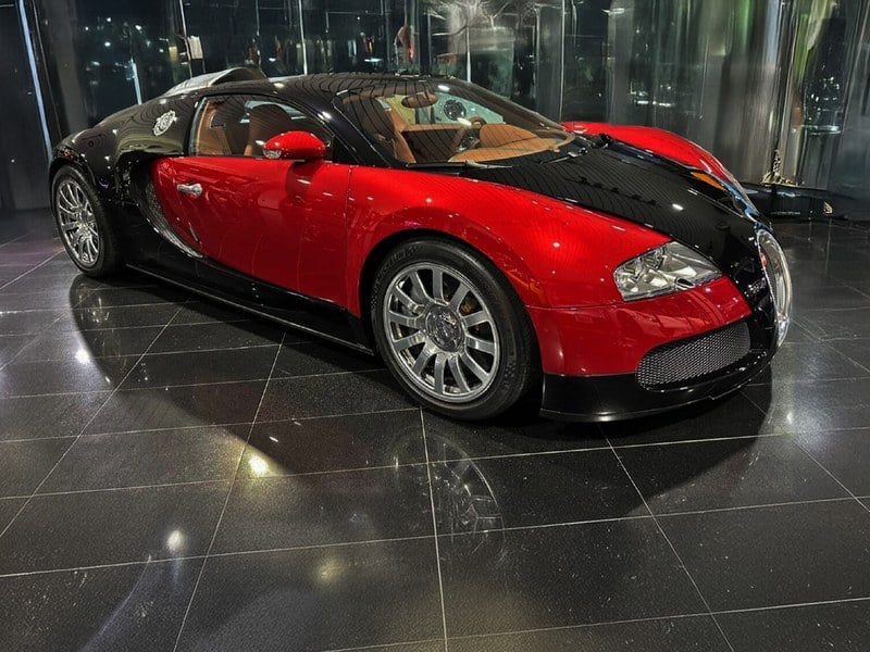 This is a 2009 Bugatti Veyron 16. 4, a GCC-spec model. The exterior features a striking color scheme with a black base and Italian Red accents. The interior is finished in an elegant brown, creating a truly exclusive atmosphere. The vehicle is in excellent condition, protected by a new paint protection film (PPF) that is guaranteed for 10 years. It also has brand-new tires and has been fully maintained. The car is currently located in Dubai and is highly sought after in the GCC market. It's a very attractive option for anyone looking for a special edition Veyron