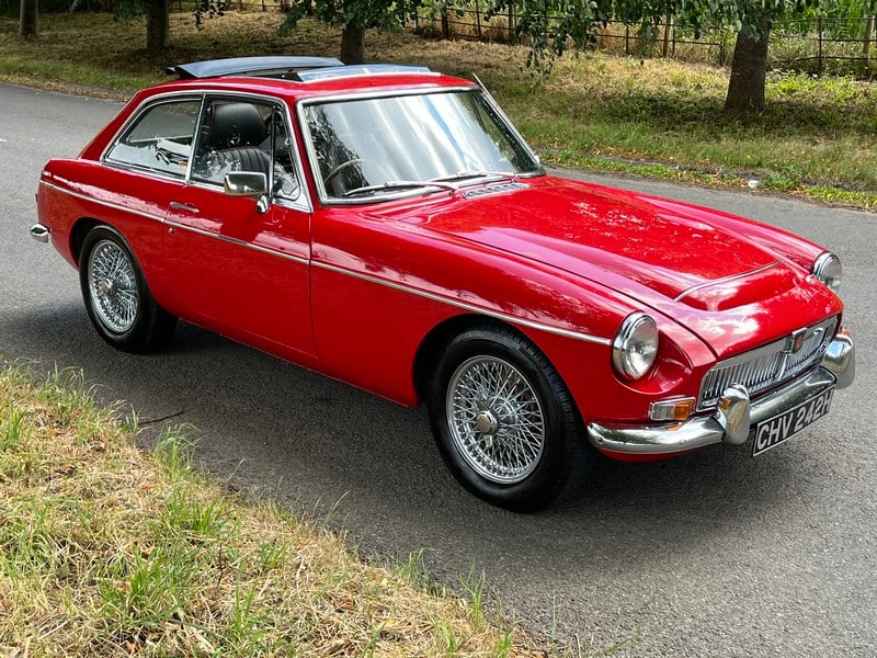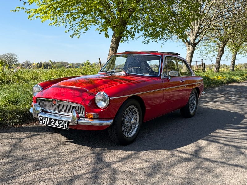 Ursprünglich zwischen dem 10. und 13. Juni 1968 gefertigt und am 28. Juni 1968 an den führenden britischen MG-Händler University Motors Limited, London, geliefert, verließ dieses echte UK- Marktfahrzeug mit Rechtslenkung das Werk in Tartan Red mit schwarzer Innenausstattung, rot abgesetzt. Zur Serienausstattung gehörten 72-Speichen-Wettbewerbs-Speichenräder, Overdrive (3. und 4. Gang), Heizung und SP-Radialreifen. Erstmals in North West London am 19. September 1969 als CHV 242H zugelassen, trägt das Auto heute noch stolz seine Originalkennzeichen. Zu einem frühen Zeitpunkt seiner Geschichte wurde außerdem ein Vollglas-Webasto-Glasschiebedach nachgerüstet.