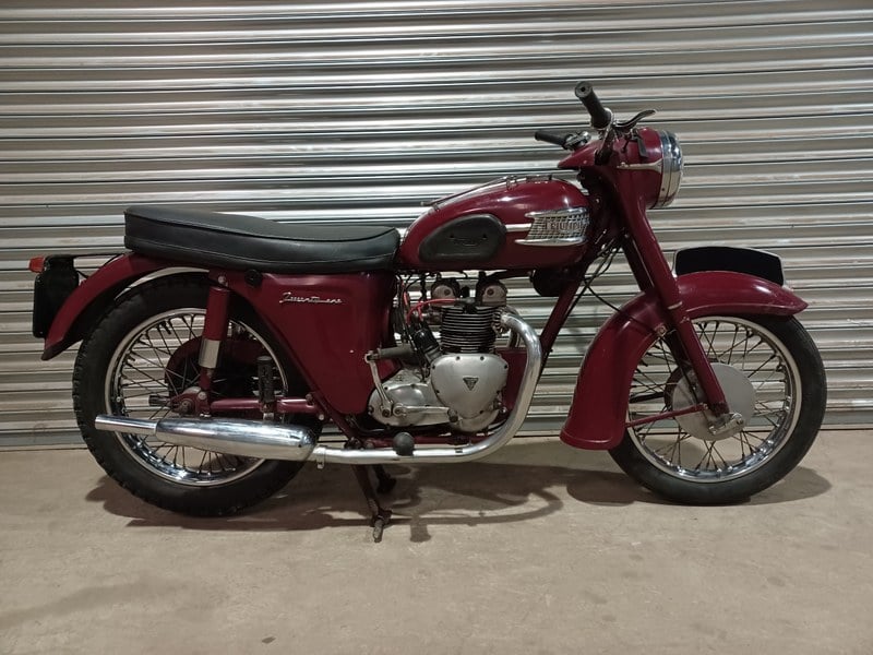 1960 Triumph 3ta / Twenty One 350cc, Matching Numbers, mit originalen Stahl-Bikini-Verkleidungen. Die Triumph ist sauber und ordentlich und mit ihren originalen Dunlop-Chromrädern ausgestattet, die sich in gutem Zustand befinden; allerdings ist die Lackierung am Benzintank nicht besonders gut. Die Triumph hat eine neue Batterie und Zündspule verbaut, und alle elektrischen Systeme funktionieren. Die Triumph startet problemlos, läuft und fährt gut, und der Motor ist schön leise. Wir haben den Triumph mit einem externen Tank getestet, da der Benzintank eine Reinigung vertragen könnte. Ein hübsch aussehendes und gut nutzbares kleines Triumph-Zweizylinder-Bike.