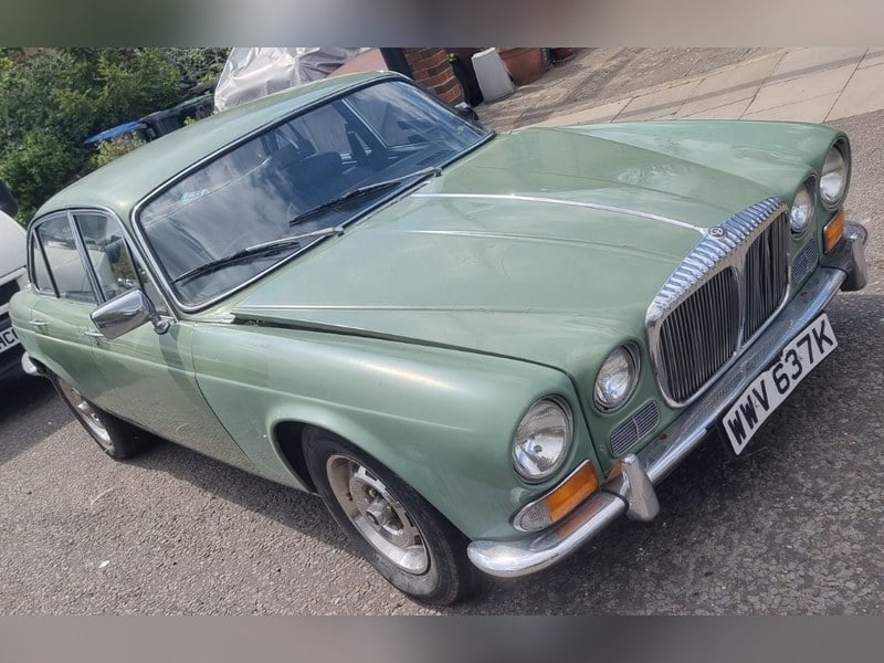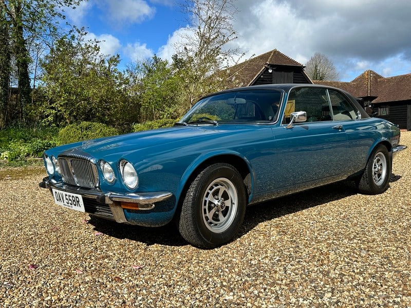 1976 Daimler Sovereign 4. 2 XJ Two door coupe finished in Squadron Blue with navy blue leather interior, Black Vinyl ever-flex Roof and sitting on period correct Kent Alloy wheels. A very rare car which was only made for two years (1975/ 77) and marketed initially as Daimler Sovereign 4. 2 two door.