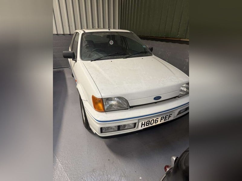 Registriert am 30. April 1991, präsentiert sich dieses Exemplar als begehrter Fiesta der XR2i-Ära in Diamond White mit blauen Streifen, Frontstoßstange mit vier Leuchten und grauem Stoffinterieur