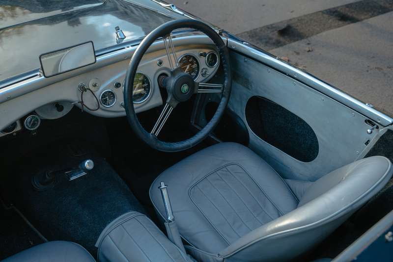 Das Farbschema und der Verzicht auf Stoßstangen machen ihn zu einem sehr ansprechenden Auto. Innen gibt es eine gut erhaltene graue Lederausstattung mit Originalmerkmalen, einschließlich des gefederten Dreispeichen-Lenkrads. Der Zustand ist nutzbar und präsentabel, aber die Lackierung zeigt altersbedingte Spuren. Wir glauben, dass dies dem Auto zusätzlichen Charakter verleiht, doch natürlich gibt es Spielraum, es auf das nächste Level zu heben. Der ursprüngliche Windschutzrahmen wurde überholt, ist derzeit jedoch nicht am Auto angebracht.