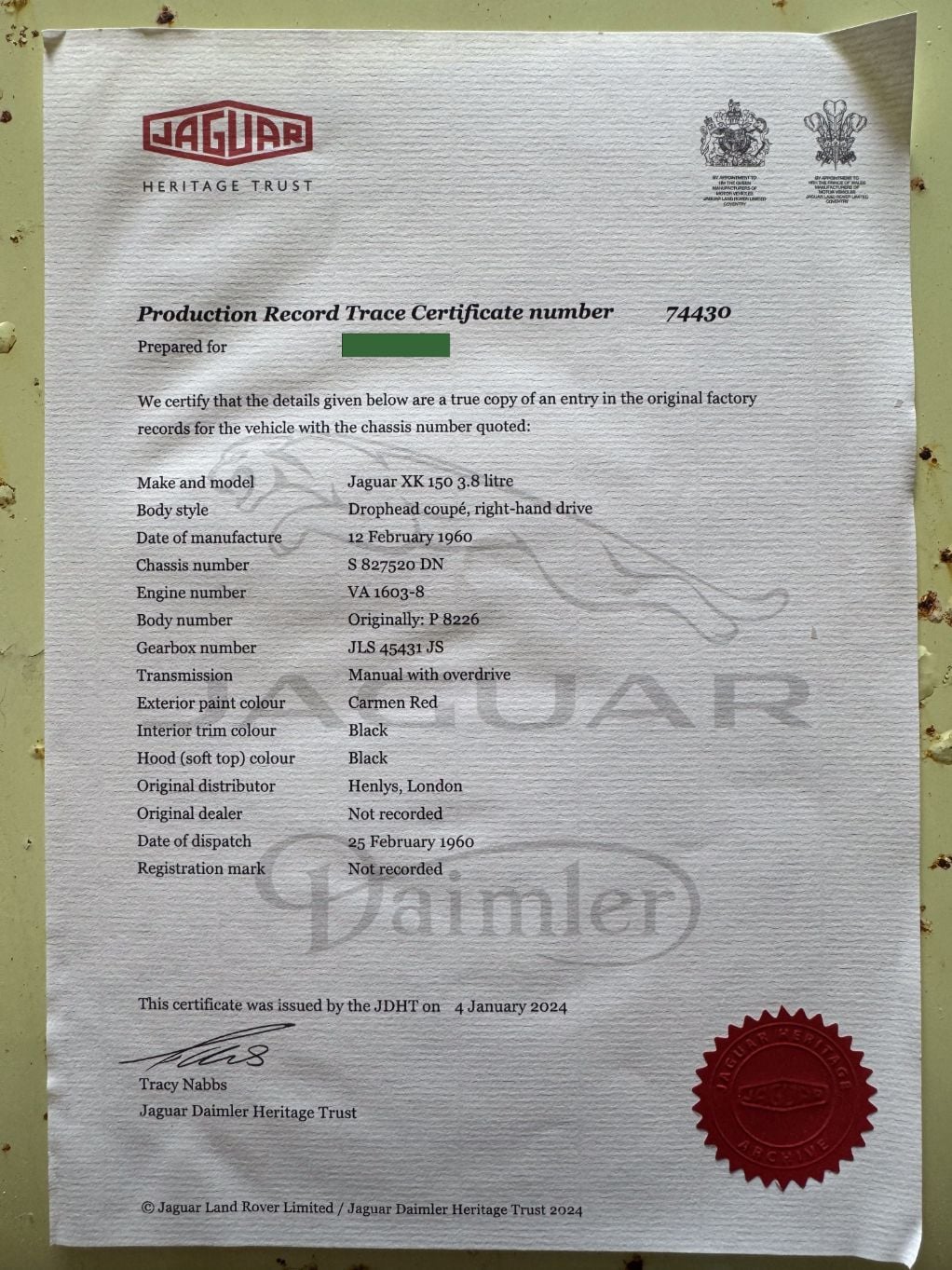 • Zertifikat des Jaguar Heritage Trust, in dem die ursprünglichen Spezifikationen des Fahrzeugs beschrieben werden