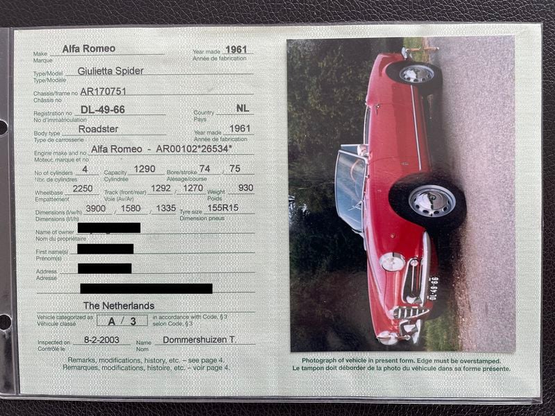 - 1961 Alfa Romeo Giulietta Spider, with the current owner being the third registered keeper