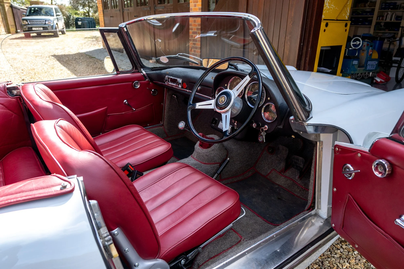 Der Wagen präsentiert sich in Alfa-Weiß, wobei die Lackierung durch eine schöne burgunderrote Lederausstattung ergänzt wird. Die Kabine und das Dach wurden vor kurzem restauriert und bilden zusammen mit der Lackierung ein Auto, das auf hohem Niveau geliefert wird. Der Wagen verfügt über einen brauchbaren Werksstandard, einschließlich der Stahlfelgen, und die Kabine behält ihre schönen Details, einschließlich der Veglia-Zifferblätter und eines klassischen Radios. Alles funktioniert einwandfrei, und der Besitzer hat keinerlei Probleme oder offensichtliche Schäden innen oder außen festgestellt.