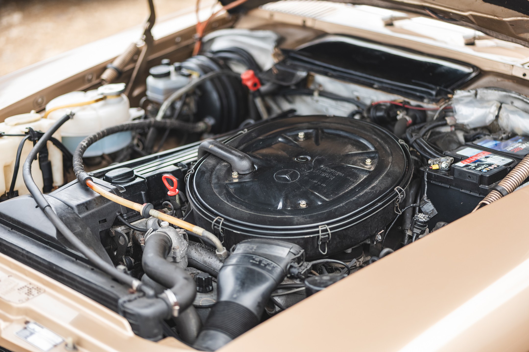 Dieses Exemplar aus dem Jahr 1987 ist genau das - und es ist ein echter Hingucker. Champagnergoldene Lackierung mit schokoladenbraunem MB-Tex Innenraum. Das ist eine zeitlose Kombination für ein zeitloses Auto - eines, das Luxus lebt und atmet.