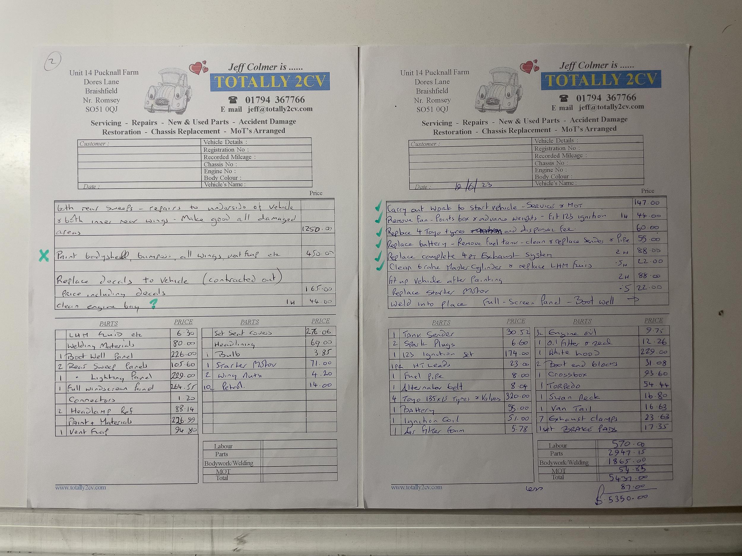 - Several invoices for the restoration work at Totally 2CV
