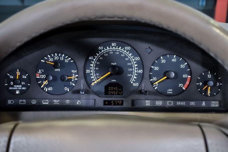 Dieses besondere Exemplar zeichnet sich durch einen bemerkenswert niedrigen Kilometerstand von nur 45.212 Meilen, einen einzigen Besitzer und eine umfassende Wartungshistorie aus. Die Kombination aus dem leistungsstarken 5,0-Liter-V8-Motor, der Originallackierung in Rauchsilbermetallic und dem beigen Lederinterieur ergibt ein Paket, das den Mercedes-Benz Luxus der späten 90er Jahre in seiner schönsten Form verkörpert.