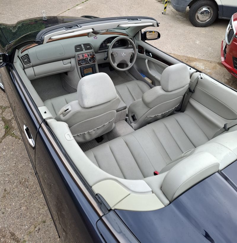 Der 3,2-Liter-V6-Motor mit 225 PS verleiht dem Paket eine ordentliche Portion Leistung. Gute Cabriolets wie dieser CLK320 werden immer seltener, vor allem, wenn man den geringen Kilometerstand dieses Wagens bedenkt. Der Wagen ist in der beliebten Kombination aus Tansanitblau-Metallic und Elegance-Spezifikation lackiert. Es handelt sich um ein gehobenes Elegance-Modell mit umfangreicher Werksausstattung, darunter elektrische Sitze, Walnussholzfurniere und ein Windabweiser.