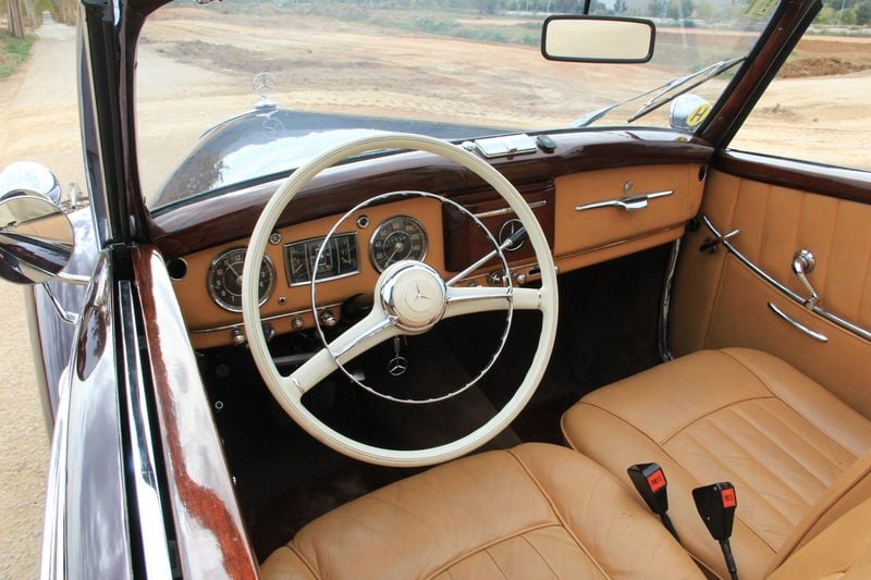 Como atestiguan las fotografías, el Mercedes está en muy buenas condiciones generales; su restauración más antigua se mantiene claramente bien. El equipaje instalado es un verdadero deleite de contemplar. Hay una leve pátina en la pintura y en el aspecto con el paso del tiempo desde la restauración, pero el 220 A se presenta impecable en cualquier caso y su techo plegable se dice que funciona correctamente.