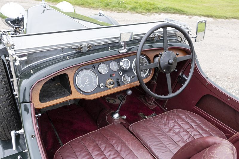 Es realmente un magnífico ejemplo del Speed 20. Bodied by Vanden Plas con una carrocería larga, baja y de cuatro plazas, está acabado con gusto en verde oscuro con cabina burgundy. El interior burgundy. Neat details like those black wires add to the effect.