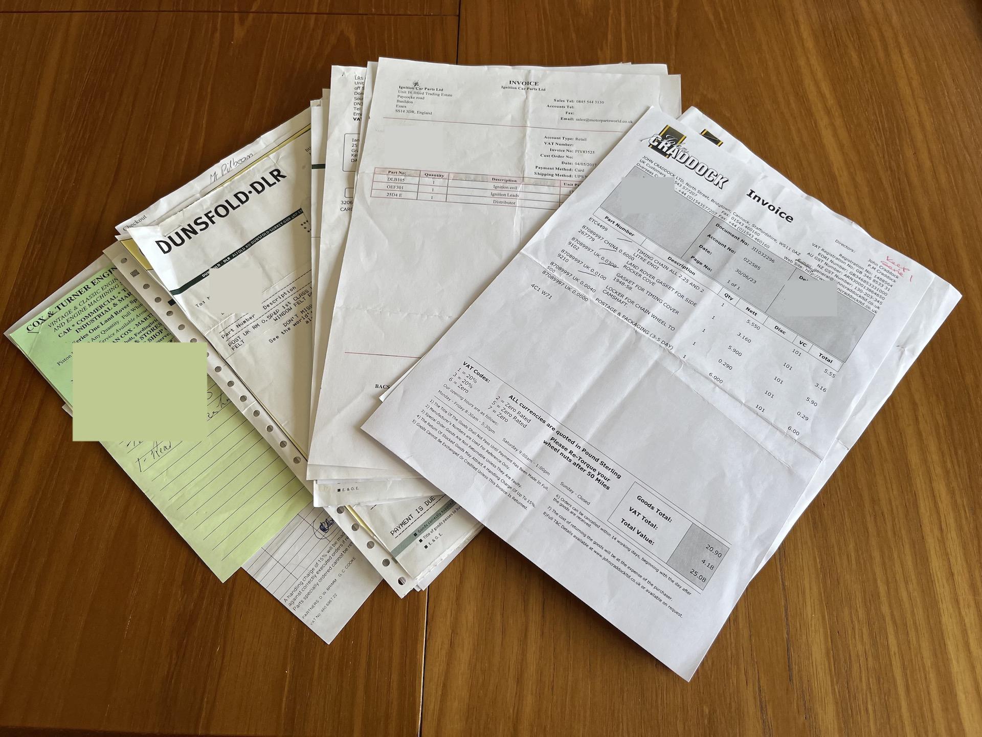 • The history file includes a large number of invoices which document all the parts acquired for the restoration
