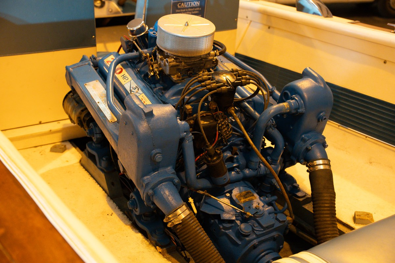 Después de sacar 25 años de almacenamiento el mes pasado, se vació el depósito de combustible y se llenó con gasolina nueva E5. Se quitaron las bujías y se les añadió aceite a los cilindros antes de intentar girar el motor a mano para verificar que no hubiera válvulas trabadas, etc. Luego se enjuagaron los cilindros con diésel y, tras montar una batería nueva, se giró el motor varias veces con el arranque. Las bujías se reemplazaron por 8 bujías NGK de alto rendimiento nuevas (también hay un juego de repuesto de bujías Champion UJ6 nuevas de la época originales para la boat). Se revisó el sistema de combustible, incluido el filtro/separador de agua y se primó el sistema de combustible. Se revisaron los puntos. También se verificó el aceite del motor y luego se hizo girar el motor con el arranque; tras unas cuantas vueltas, encendió y rugió con su fabulosa sonoridad V8 a través de su sistema de escape doble posterior, como se puede ver en el video.