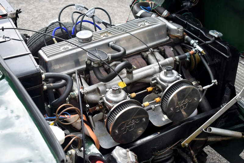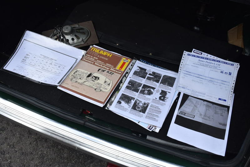 A finales de los años 60, un motor de dos litros de seis cilindros habría dado al dueño del coche derechos de alarde en el pub, como también lo haría una insignia de Overdrive prominente en la tapa del maletero. Hoy, el murmullo de ese icónico motor ofrece una banda sonora emocionante a uno de los últimos modelos Mark 1 Vitesse que salieron de la línea de producción de Canley. Acabado en British Racing Green, este coche se ofrece al mercado con características auténticas Mark 1 como llantas ligeramente patinadas junto a una rueda de repuesto de la época y un kit de cambio de neumáticos en el maletero. Donde se han realizado modificaciones – como la adición de asientos delanteros Mazda MX-5 – se han integrado de forma sensible y discreta. El capó recientemente reemplazado es un ejemplo perfecto de esto.