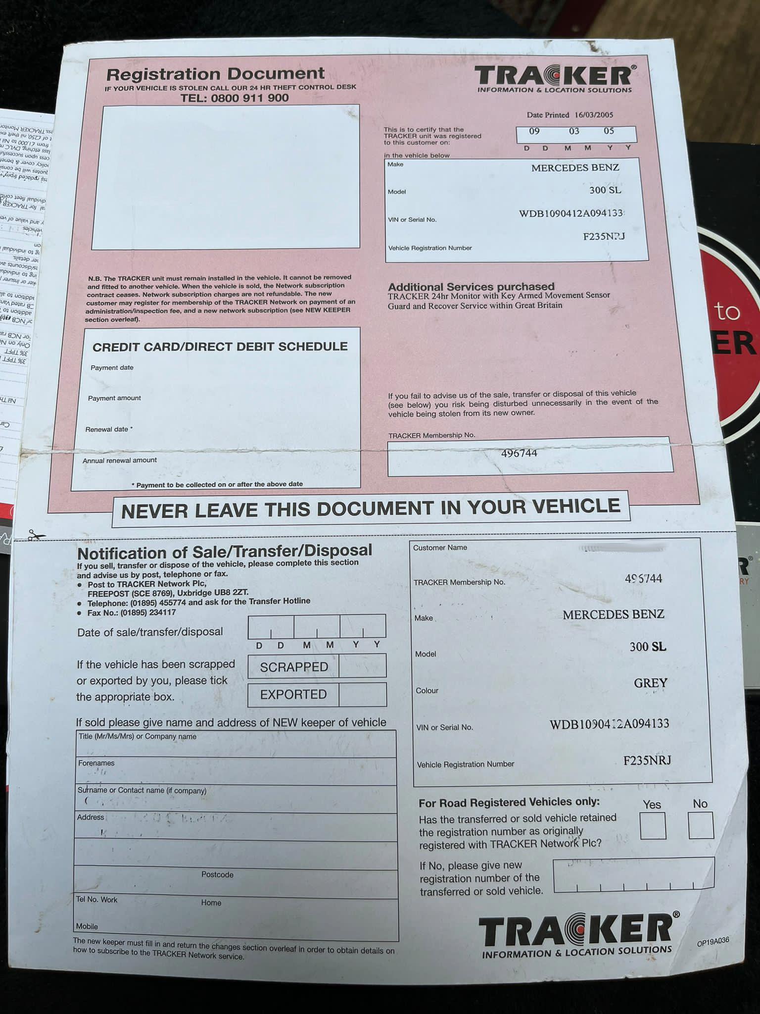 • Paperwork from 2005 showing a Tracker monitor system at an expense of £1,046.50 which included a £325 lifetime subscription