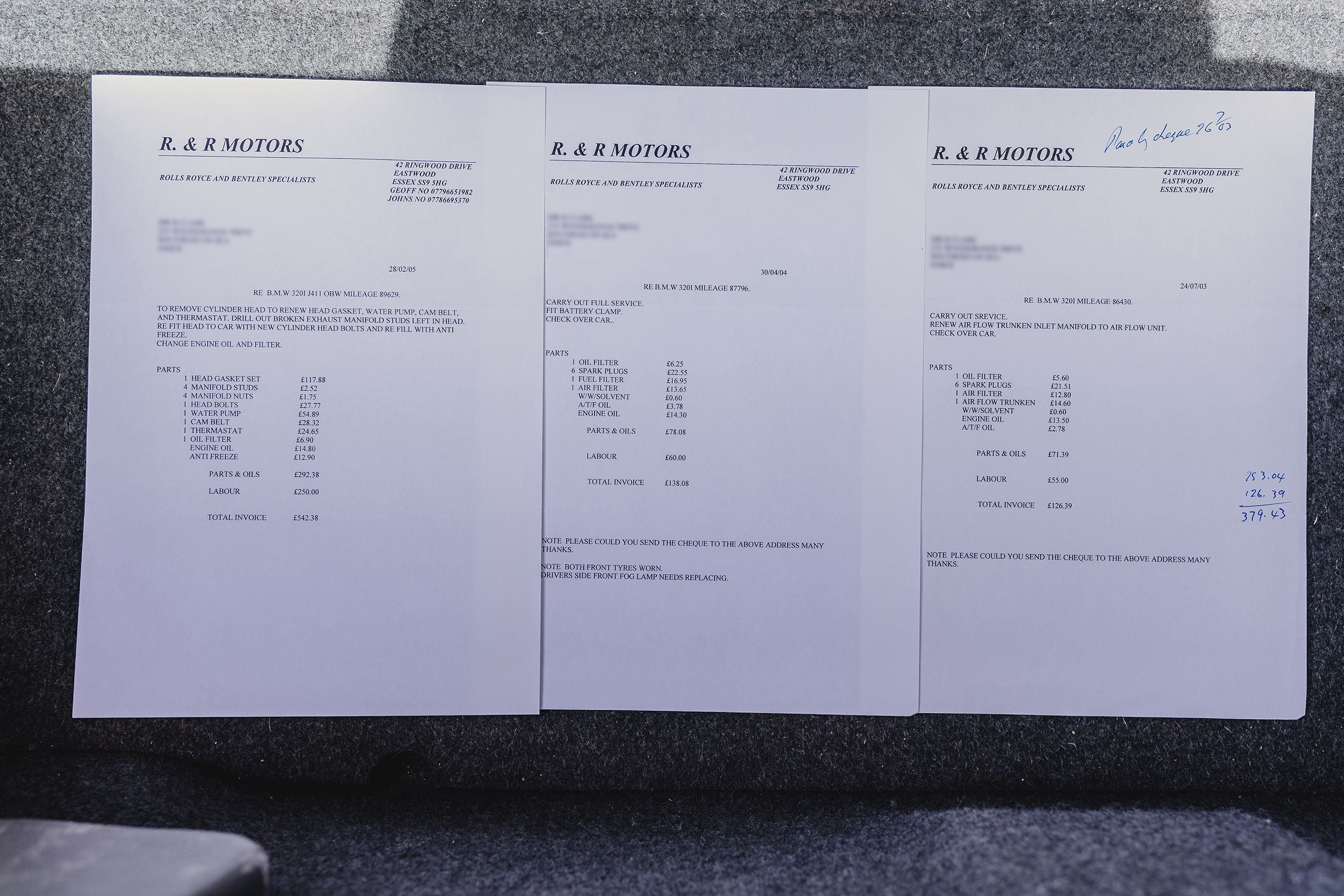 • Further servicing work documented in history file invoices shown in photographs