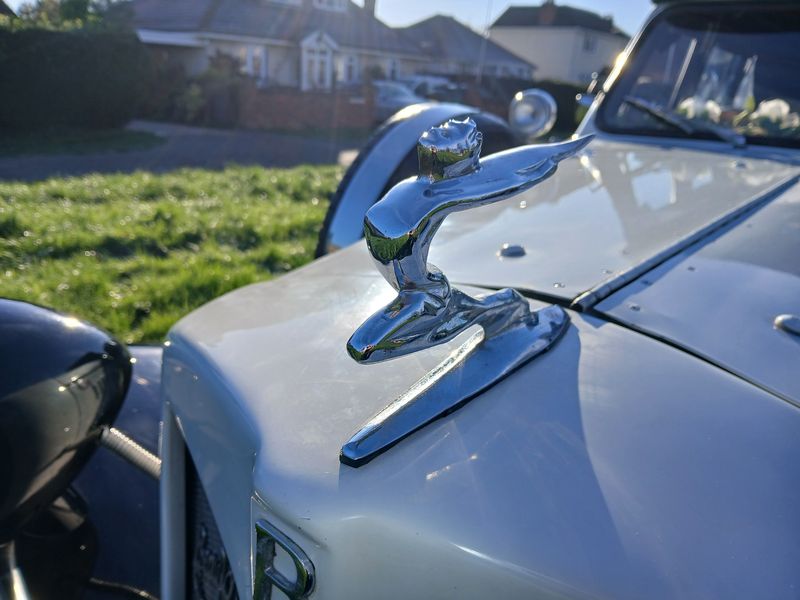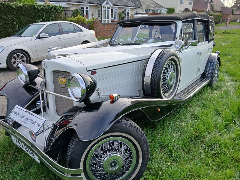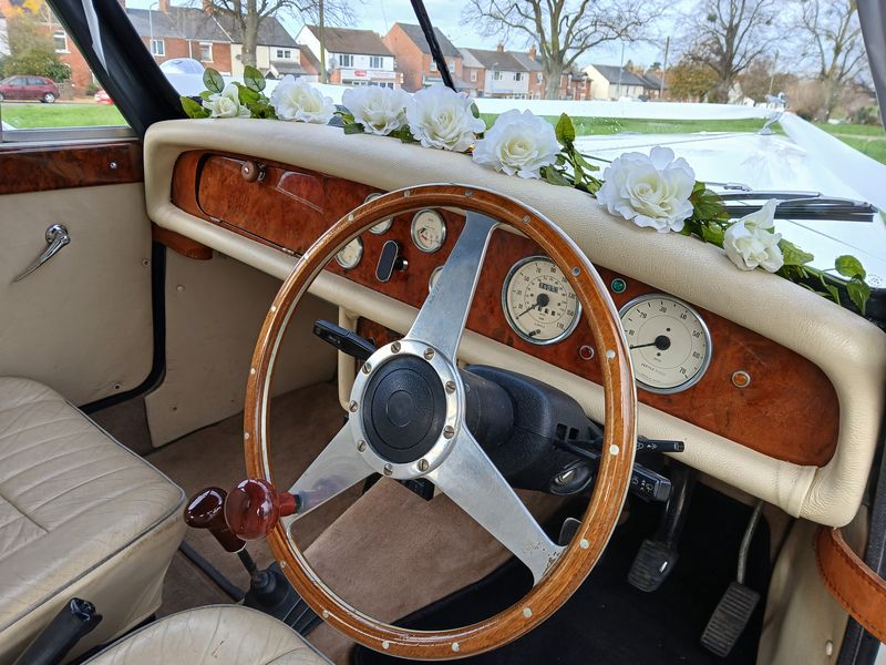 “Este vehículo es blanco con estribos negros, pasos de rueda negros y techo de mohair, lo que lo hace ideal y muy popular para bodas ya que complementa cualquier esquema de color. Un verdadero imán para miradas. La bocina Klaxon es muy popular y hace sonreír a la gente. Las novias adoran bajar el techo con buen tiempo.”