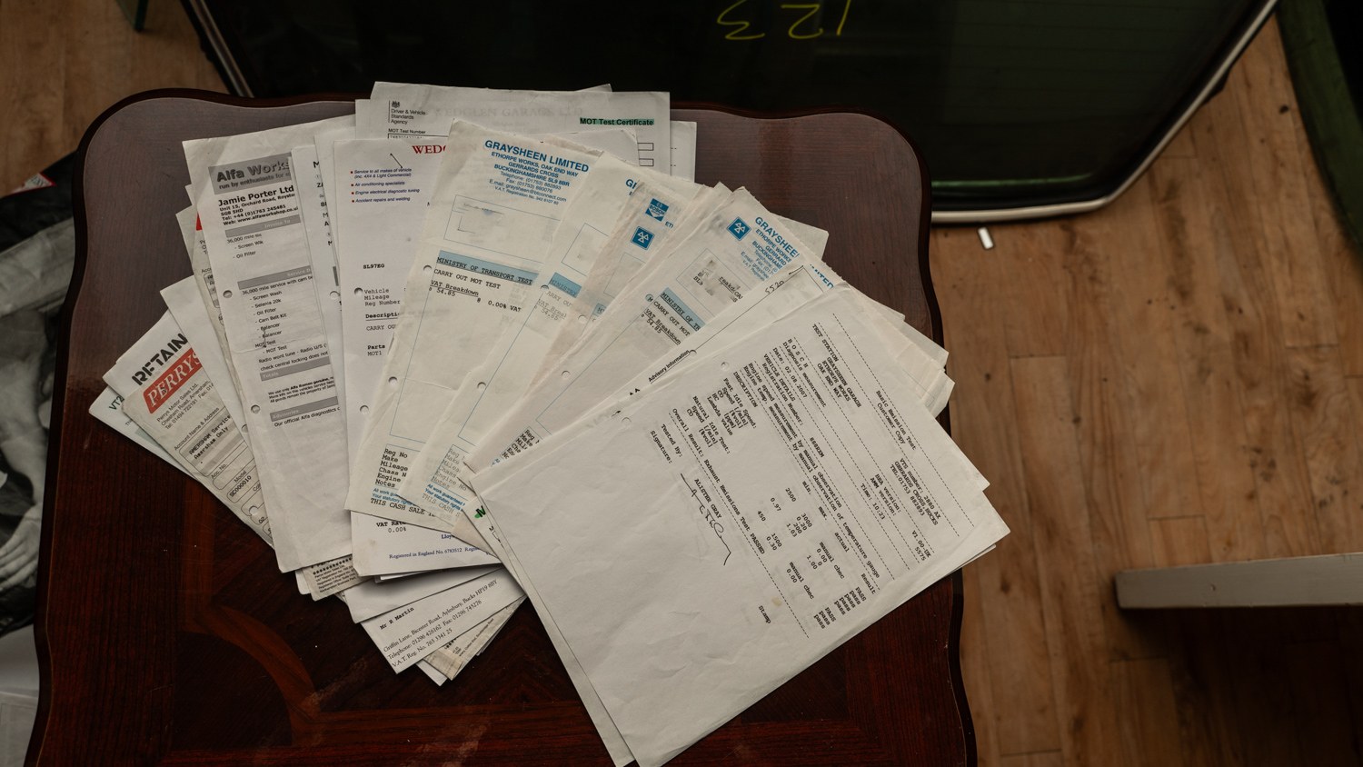 - Old servicing invoice from Perrys and independent specialist Alfa Workshop/Jamie Porter Ltd