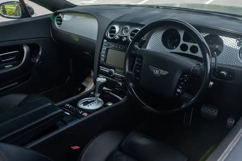 Originalmente pedido en Beluga Black con interior a medida PC1 Mulliner y piel principal y secundaria Beluga, asientos acolchados en diamante con la opción de costura Portland Grey en contraste en todos los asientos y emblemas Portland Grey de Bentley en los reposacabezas. Alfombrillas y techo en Beluga black completan el pedido original triple negro. Otras opciones de coste adicional incluyeron:
