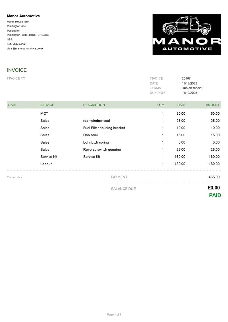 - Facturas de servicio fechadas 2023 y 2024 por Manor Automotive como se muestra