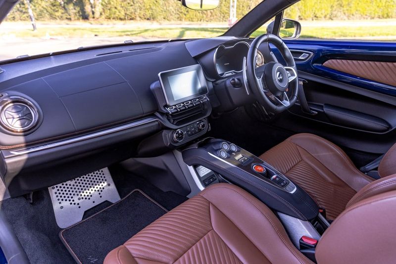 La Légende GT se sitúa en la cima de la gama A110, combinando la dinámica celebrada del coche con un confort mejorado y una especificación notablemente lujosa. Con solo 500 ejemplares fabricados, sigue siendo una de las variantes más codiciadas. Este coche en particular es el número 478 de esa tirada limitada, acabado en Abyss Blue con llantas y emblemas en tono oro rosa, luces traseras oscurecidas y el interior en cuero miel-tono interior de la edición, complementado por un aluminio de carbono trenzado en tono cobre en lugar del carbono estándar.