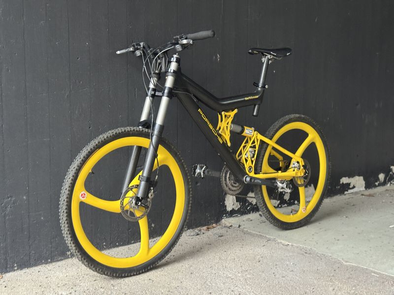 Contaba con grupos de gama alta para la época: XTR completo con frenos de disco que proporcionaban frenada hidráulica de Magura. Las llantas de carbono Spengle completaban el conjunto exótico y ligero, acabado en el mismo amarillo distintivo que el basculante, la articulación y los adhesivos. Una insignia de Porsche se encuentra en el headtube, en una forma similar a la que se encuentra en los coches.