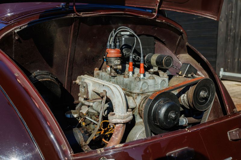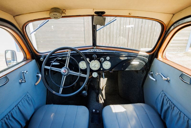 Ce bel exemple est le fruit d'une restauration ancienne et soignée, dans une livrée très élégante, avec un habitacle assorti et évocateur. C'est une véritable petite capsule temporelle, avec un habitacle simple et bien présenté, beaucoup de caractère d'avant-guerre et des chromes qui n'ont été retouchés que de manière sélective au fil des années.