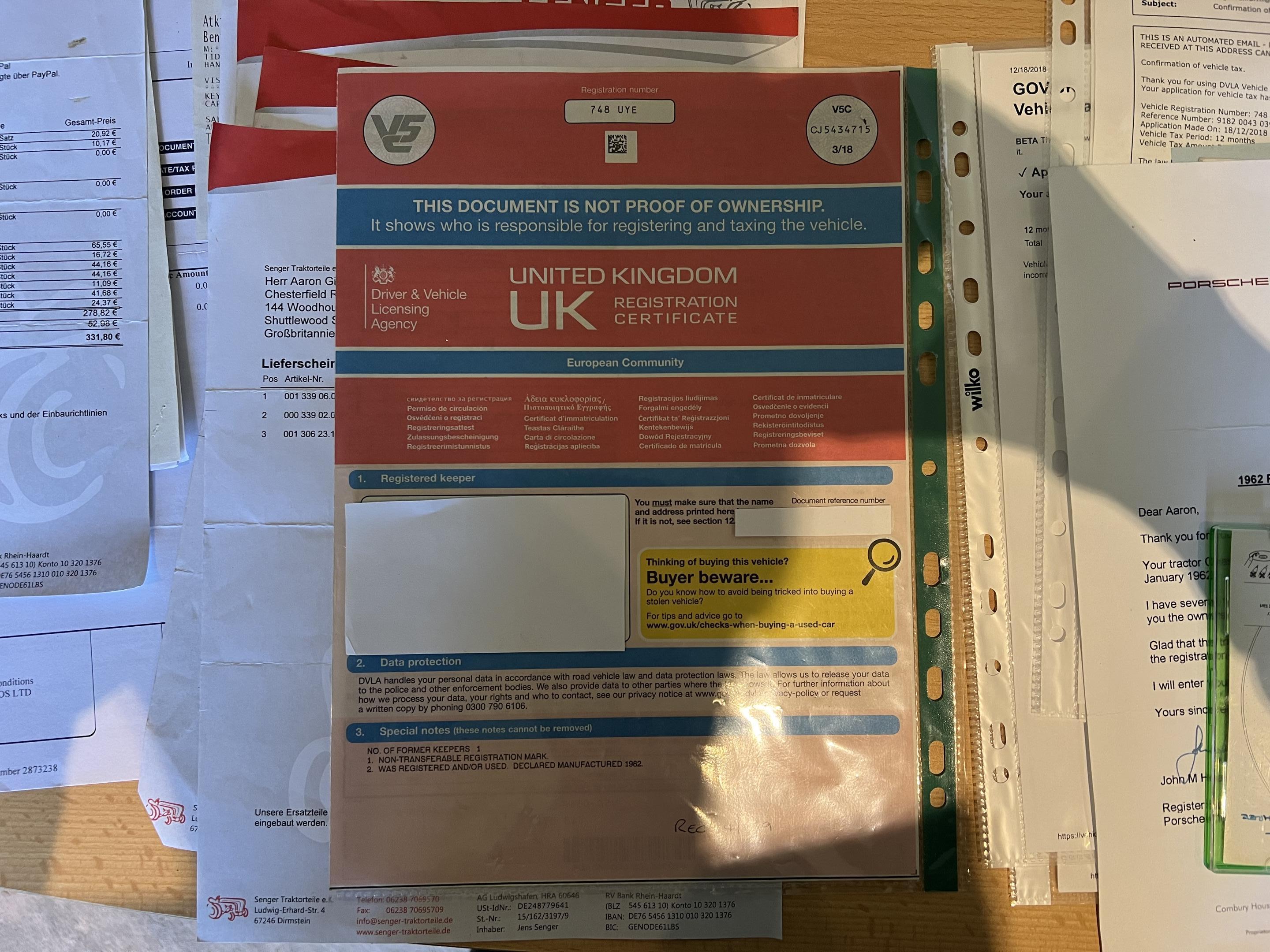 • Paperwork from the Porsche Club’s Tractor Registry tracing the tractor’s heritage