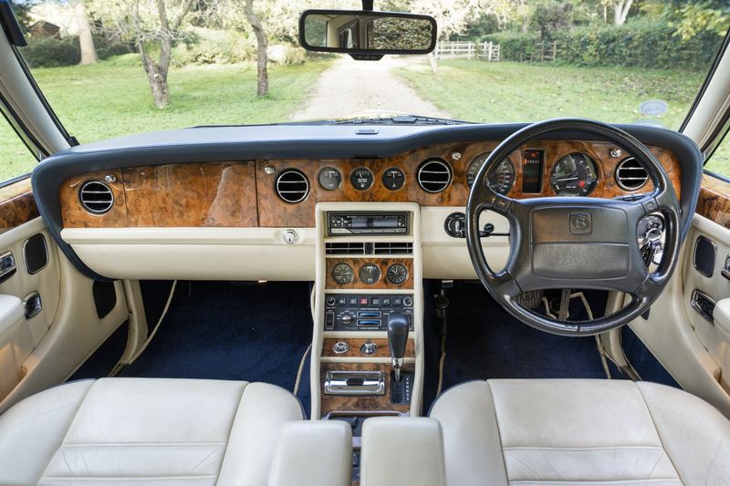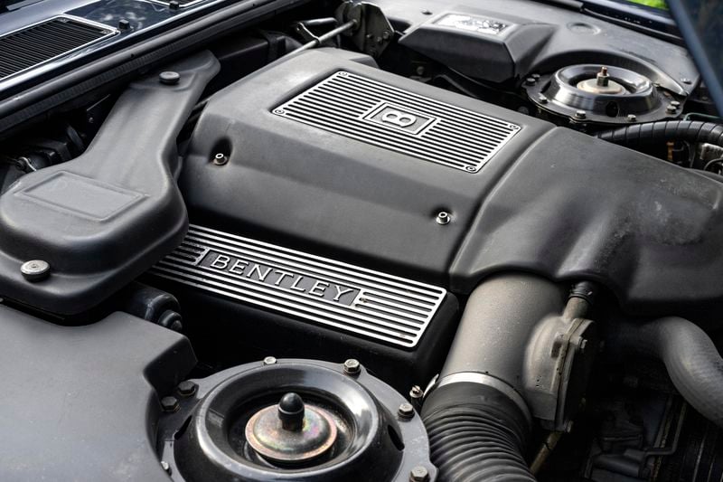 Cette Brooklands au bleu métallisé foncé bénéficie de ces changements. Elle est bien conservée à l’intérieur comme à l’extérieur et affiche une kilometrage mesuré pour son âge. Le vendeur a acquis la voiture en 2021 et a poursuivi la tradition des propriétaires précédents consistant en un entretien et une maintenance réguliers. On trouve une ribambelle de factures de ces dernières années par des spécialistes de la marque, y compris des travaux sur le système de suspension.