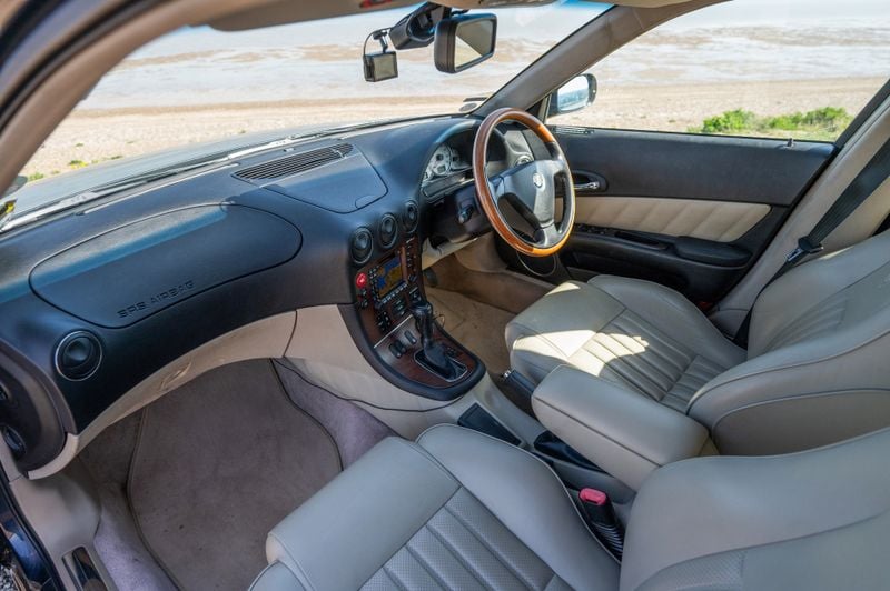 Bien qu’elle tienne ses promesses sur les trois points, principalement notable par le claquement lourdingue des ports de porte qui n’était pas typique des Alfas précédentes, la 166 n’a jamais vraiment atteint ses objectifs de vente. Cela rend tout destinataire survivant exceptionnellement rare mais particulièrement recherché, surtout le modèle V6 3L à cylindrée Busso que nous avons ici. C’est une Lusso de haute spécification avec la boîte Sportronic polyvalente qui offre un passage semi- automatique séquentiel avec un mode auto total.