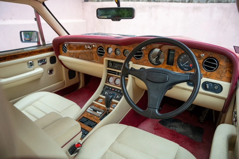 La véritable magie réside à l’intérieur de n’importe quelle Bentley, et ce modèle est doté d’un intérieur en cuir Magnolia fini avec des surpiqûres rouge Saint-James, ainsi qu’une tablette et une doublure de pavillon assorties Magnolia. Le tableau de bord montre une légère patine sur ses plastiques, mais la garniture en noyer est en état superbe, avec l’affichage classique à huit cadrans et l’accouplement chromé inchangé par la présence d’un autoradio Blaupunkt. Les tapis en moquette à poils longs montrent des signes d’usure, mais les panneaux de porte ont été superbement conservés et le coffre tapissé de moquette burgundy est presque comme neuf.