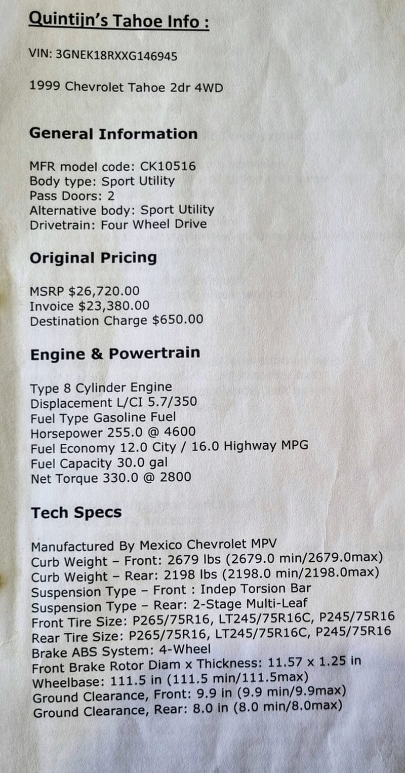 Le véhicule est accompagné d'une documentation impressionnante comprenant la facture d'achat originale du concessionnaire américain, les carnets d'entretien complets et tous les certificats de contrôle technique/APK depuis l'origine. Une nouvelle peinture professionnelle en 2009 a permis à ce Tahoe de garder un aspect frais, tandis que des améliorations de performance telles que les amortisseurs Koni renforcent son châssis performant.