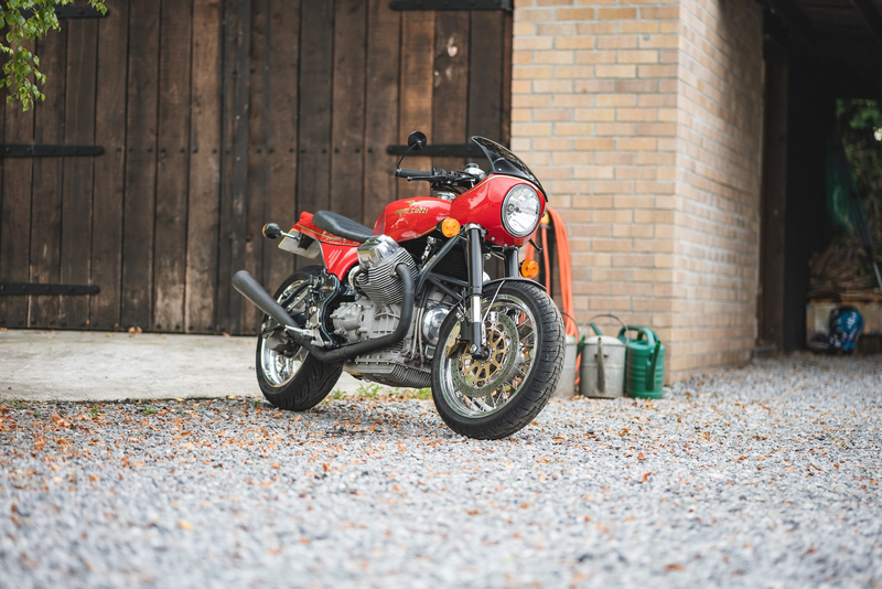 Bien qu'il s'agisse d'une machine moderne, la Guzzi a une esthétique classique et intemporelle qui rappelle l'âge d'or de la mécanique et cet exemplaire particulier a été entièrement personnalisé avec de nombreuses pièces de qualité.