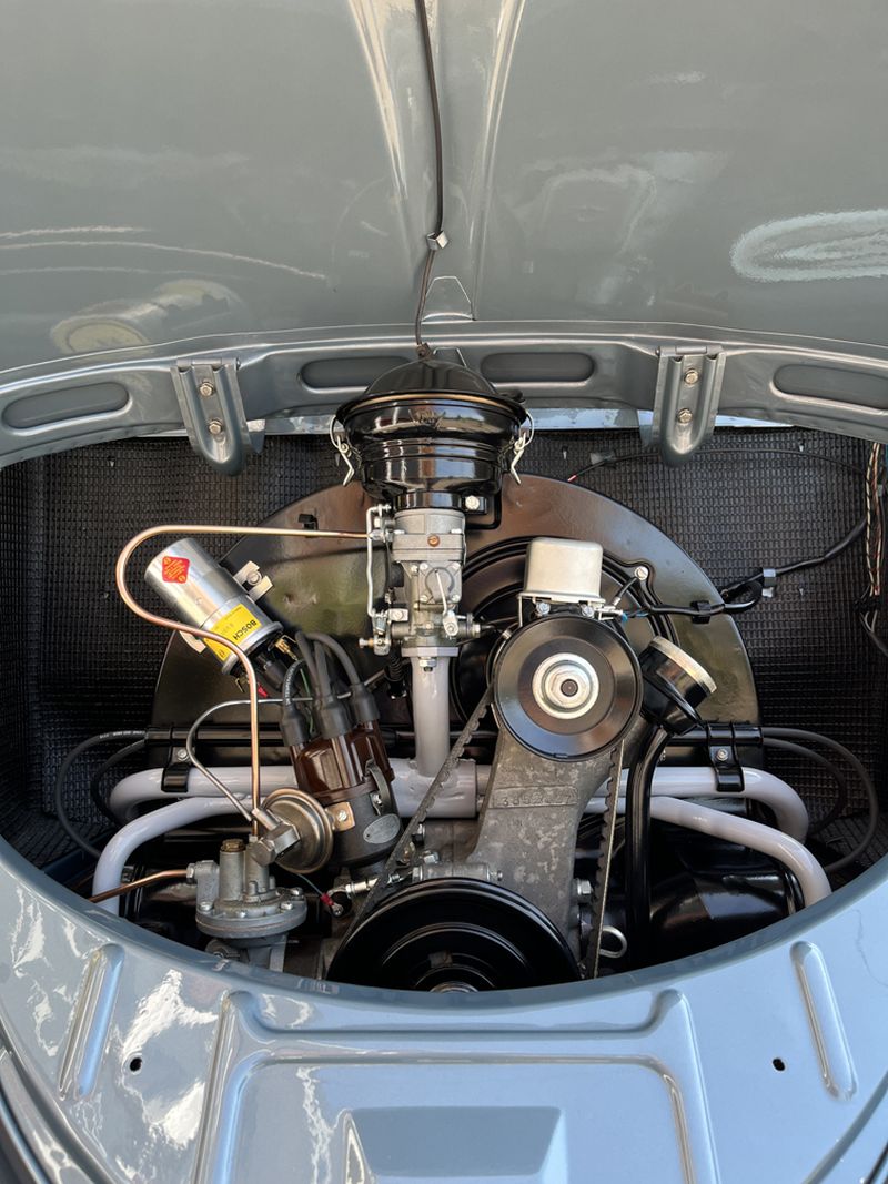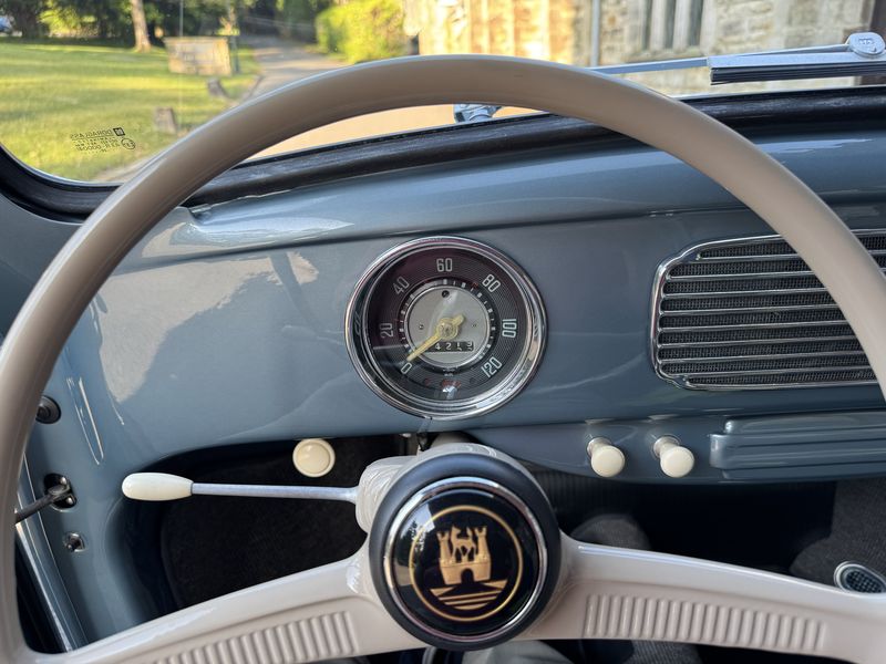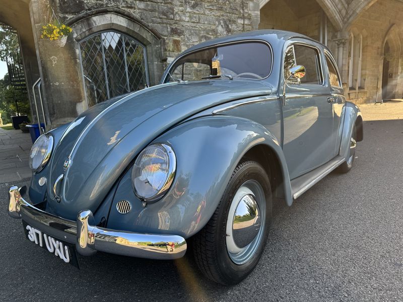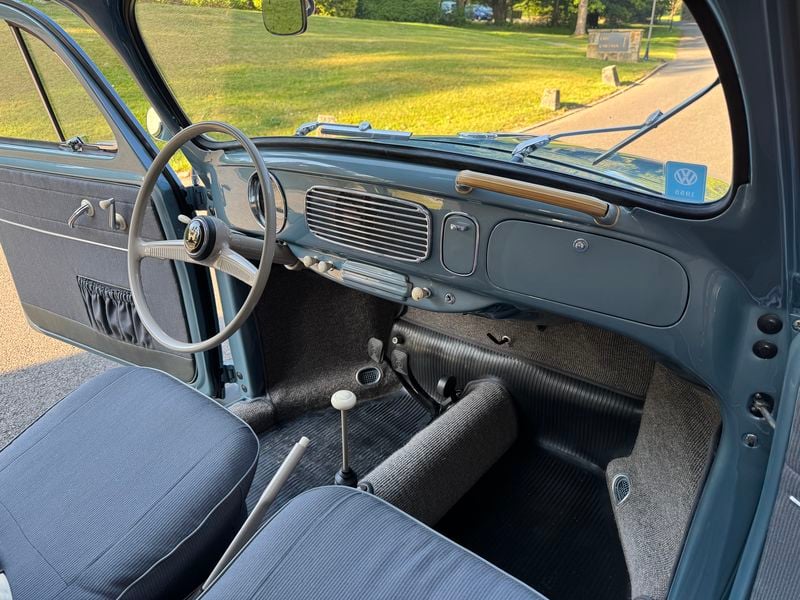 Questo Maggiolino Deluxe "Oval Window" del 1955 ha trascorso la sua vita in Svezia con il suo primo proprietario fino al 2006, prima di arrivare nel Regno Unito. Dal 2016 al 2022 è stata sottoposta a un restauro meticoloso che le ha permesso di vincere premi e concorsi. Il lavoro è stato eseguito dagli specialisti Flatlands Engineering e Wonkey Donkey Emporium, attingendo anche alle competenze dell'azienda tedesca originaria che si occupava di rifinire queste auto per Volkswagen. L'attenzione ai dettagli è evidente nelle foto: gli appassionati noteranno le luci posteriori "a cuore", il maniglione Happich e gli indicatori di direzione a semaforo. Il fascicolo storico comprende una vasta gamma di foto e registrazioni di tutti questi lavori. C'è anche un certificato di conformità alla fabbrica.