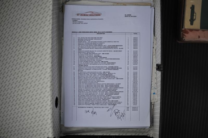Trasportata nuova da County Garage a Cheltenham, concessionaria Mercedes-Benz, nell’aprile 1969. La storia di servizio è molto buona e mostra che l’auto è stata mantenuta in modo relativamente costante a un alto standard fin dalla nuova. Le ultime manutenzioni sono state eseguite da Colin Ferns, rinomato specialista Mercedes a Richmond. L’ultima manutenzione è stata meno di 100 miglia fa. Il lavoro di restauro è stato conservato in fotografie, come si può vedere, e c’è una recente fattura per £62.000 per coprire questo lavoro.