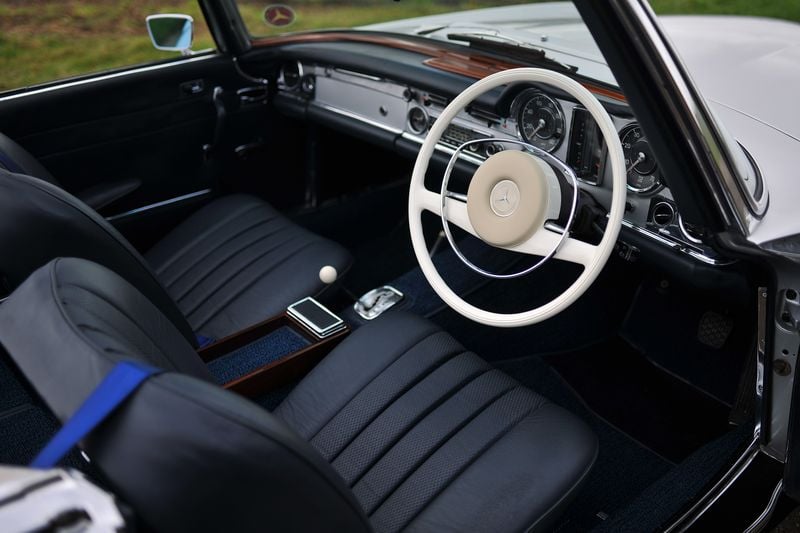 Avvolgendosi nei sedili in pelle di fabbrica, questa W113 sembra una macchina del tempo. Dai sottili inserti in noce alle cruscotti e alle cardini colorati, l'interno sbalorditivo di questa auto ti riporta a un’epoca più glamour: praticamente non ci sono elementi rivelatori dell’età dell’auto, testamento di una vita di proprietà attenta e di un restauro molto rispettoso. È chiaro sin dal primo sguardo che è stato l’orgoglio e la gioia di ogni guidatore sedutosi nel suo abitacolo opulento. I sedili sono in condizioni favolose, com’erano dovuti essere, da poco rifiniti da D-Class.