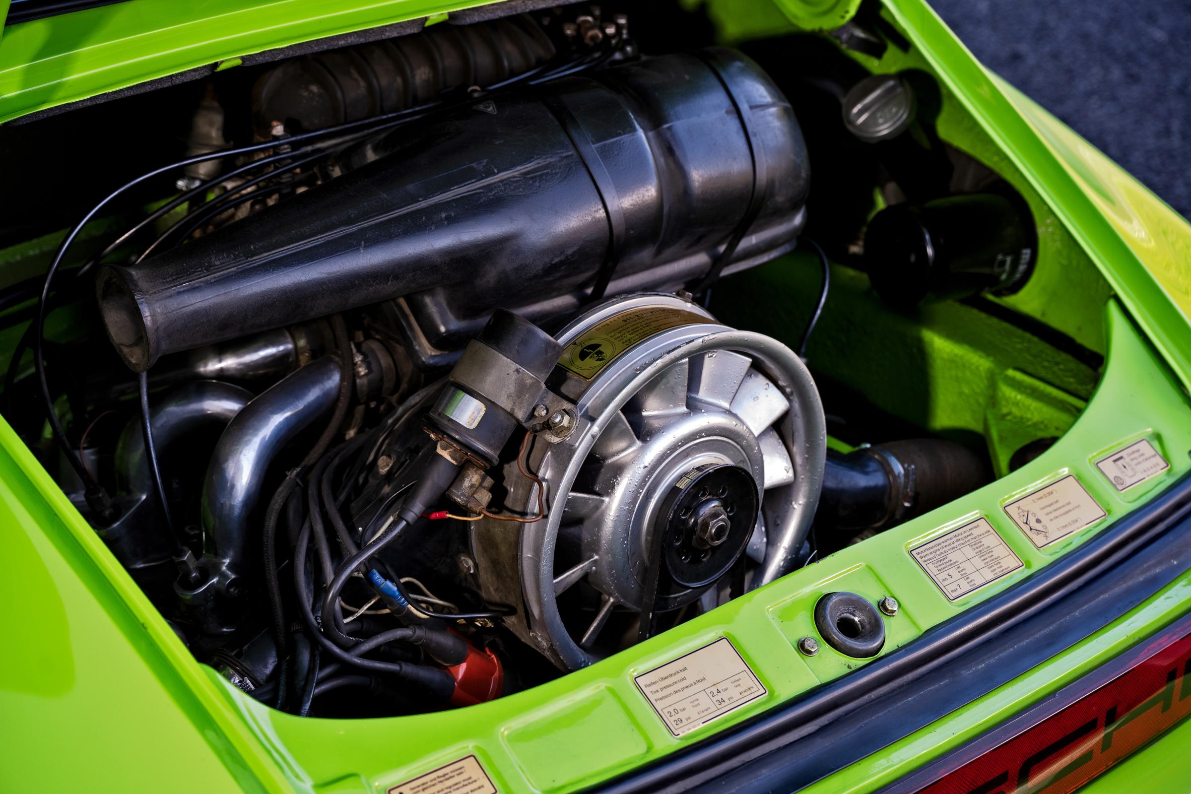 Quite rightly, the vendor decided to refinish the car in its original ‘Lime Green’ factory colour scheme. It’s a striking period colour that really suits the 911, especially with the smart ‘Porsche’ side stripes. The paintwork was professionally applied and looks to have been very well done. Other than the odd minor blemish, the only issue we noted was a small crack in the paint above the upper near-side of the engine cover. Otherwise, the paintwork presents in fine condition.