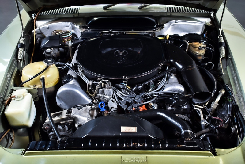 Meno dell'1% degli acquirenti contemporanei ha scelto l'opzione Silbergrun metallizzato (verde argento metallizzato), e guardando questa elegante vettura è difficile capire perché. È un colore fantastico che si addice alla R107, accentuandone in particolare l'ampia cromatura.