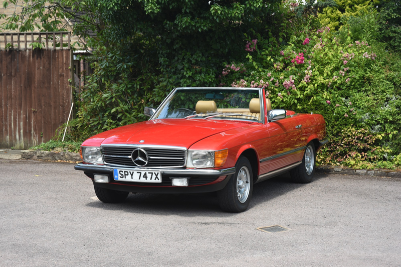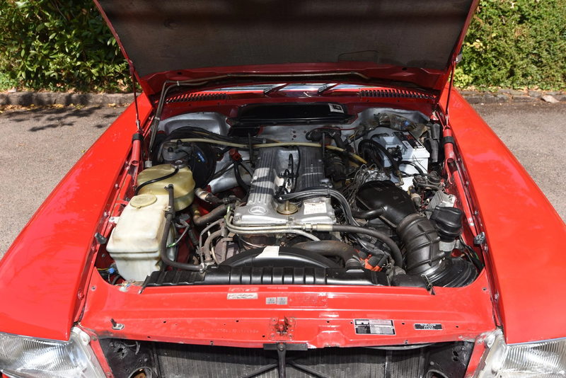 Le R107 tendono a dividersi in auto utilizzabili ad alto chilometraggio e auto da esposizione a basso chilometraggio. Questa 280SL del 1982 rientra a pieno titolo in quest'ultima categoria. Ha percorso appena 60.000 miglia da nuova ed è presentata con un colore rosso segnale su Palomino MB Tex. Dispone di opzioni desiderabili in fabbrica come i cerchi Mexican Hat "star design" e i sedili posteriori con cinture.