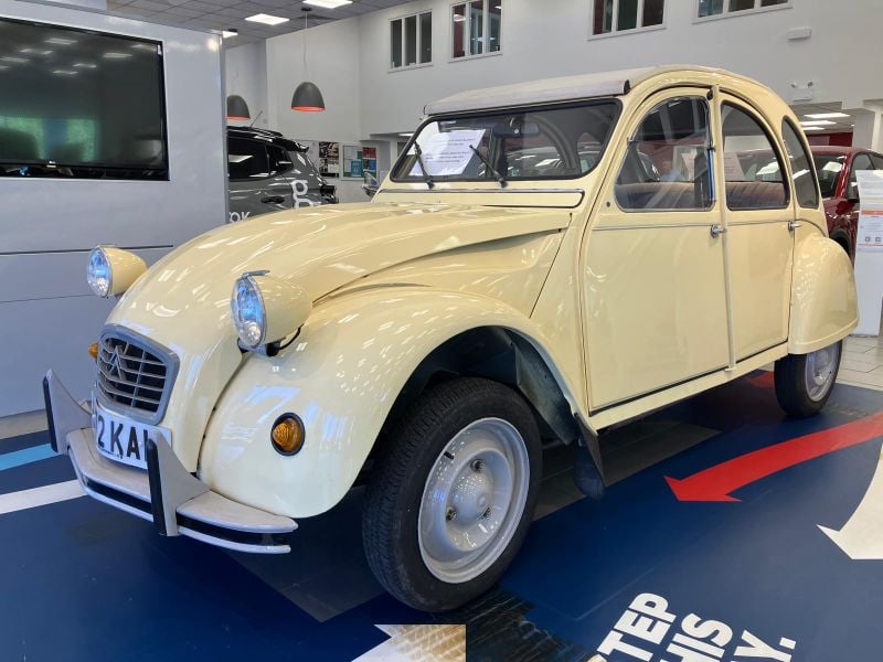 "1985 Citroën 2CV6 Special in giallo (Jaune) con 46.446 miglia autentiche registrate. Fornita nuova da Charles Lewis Citroën Ltd di Abbey Foregate, Shrewsbury, il 1° agosto 1985, la sua prima proprietaria locale ha tenuto l'auto fino al luglio 2002, percorrendo poco più di 46.000 miglia e registrando 15 servizi principalmente presso il rivenditore.
