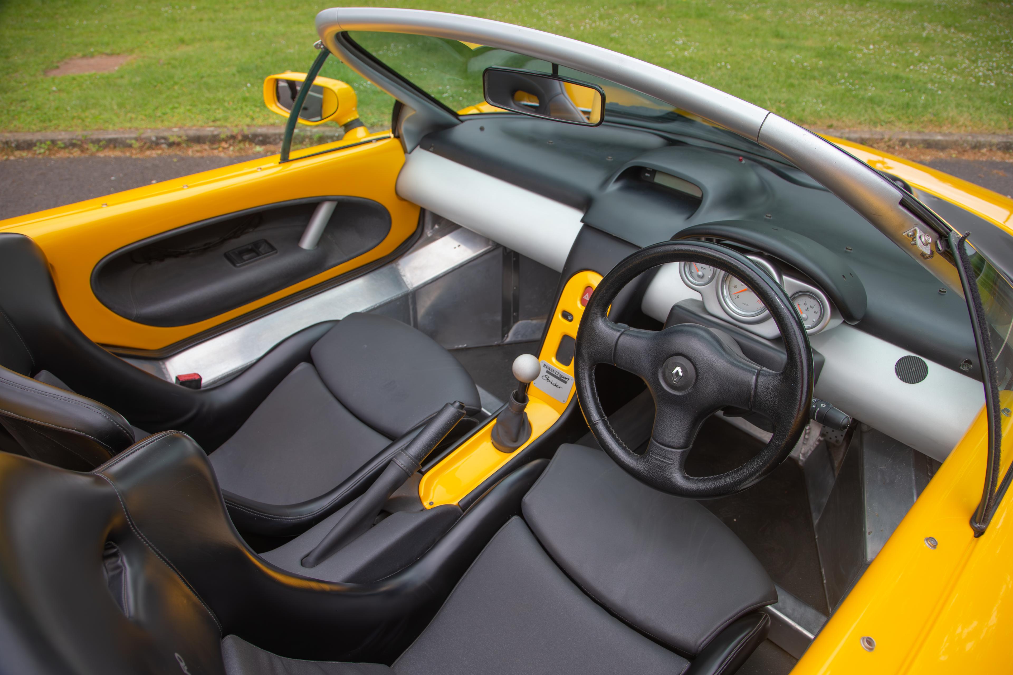 L'interno della Renault Sport Spider è praticamente il più minimale possibile, per risparmiare il maggior peso possibile. I sedili sportivi Recaro sono in ottime condizioni e non sembrano presentare segni di usura. I pannelli delle porte sono in buone condizioni e non presentano graffi o segni da evidenziare.