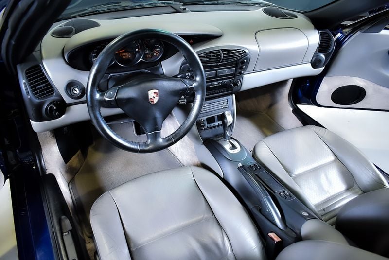 Questo 986 2.7L blue metallizzato scuro è ben conservato e ben equipaggiato. C'è pelle grigia, cerchi Turbo Twist a cinque razze, un tetto blu elegante e persino climatizzazione. L'auto dispone anche del versatile cambio semi-automatico sequenziale a 5 marce Tiptronic.