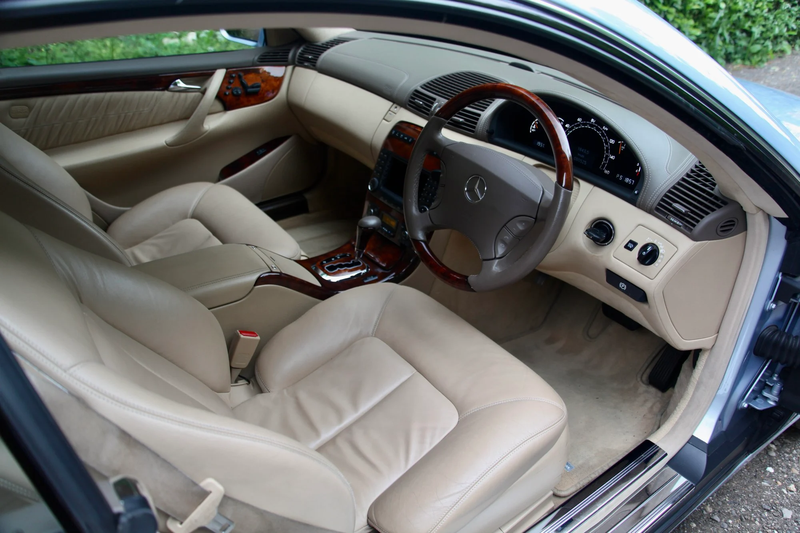 Questa CL500 del 2004 è presentata in un attraente colore blu quarzo metallizzato con pelle Java, il tutto compensato da cerchi AMG a cinque razze. L'aspetto è ottimo, aiutato dalle evidenti attenzioni dei cinque proprietari che l'hanno tenuta da nuova. Il venditore ha acquistato la vettura nel 2021 e ha mantenuto la tradizione della manutenzione regolare, indipendentemente dal chilometraggio. Durante il suo mandato, la vettura è stata revisionata annualmente dallo specialista Mercedes-Benz Derrick Wells. Altri interventi recenti hanno incluso nuovi pneumatici, una pompa ABC, un ammortizzatore di vibrazioni e nuovi dischi e pastiglie anteriori.