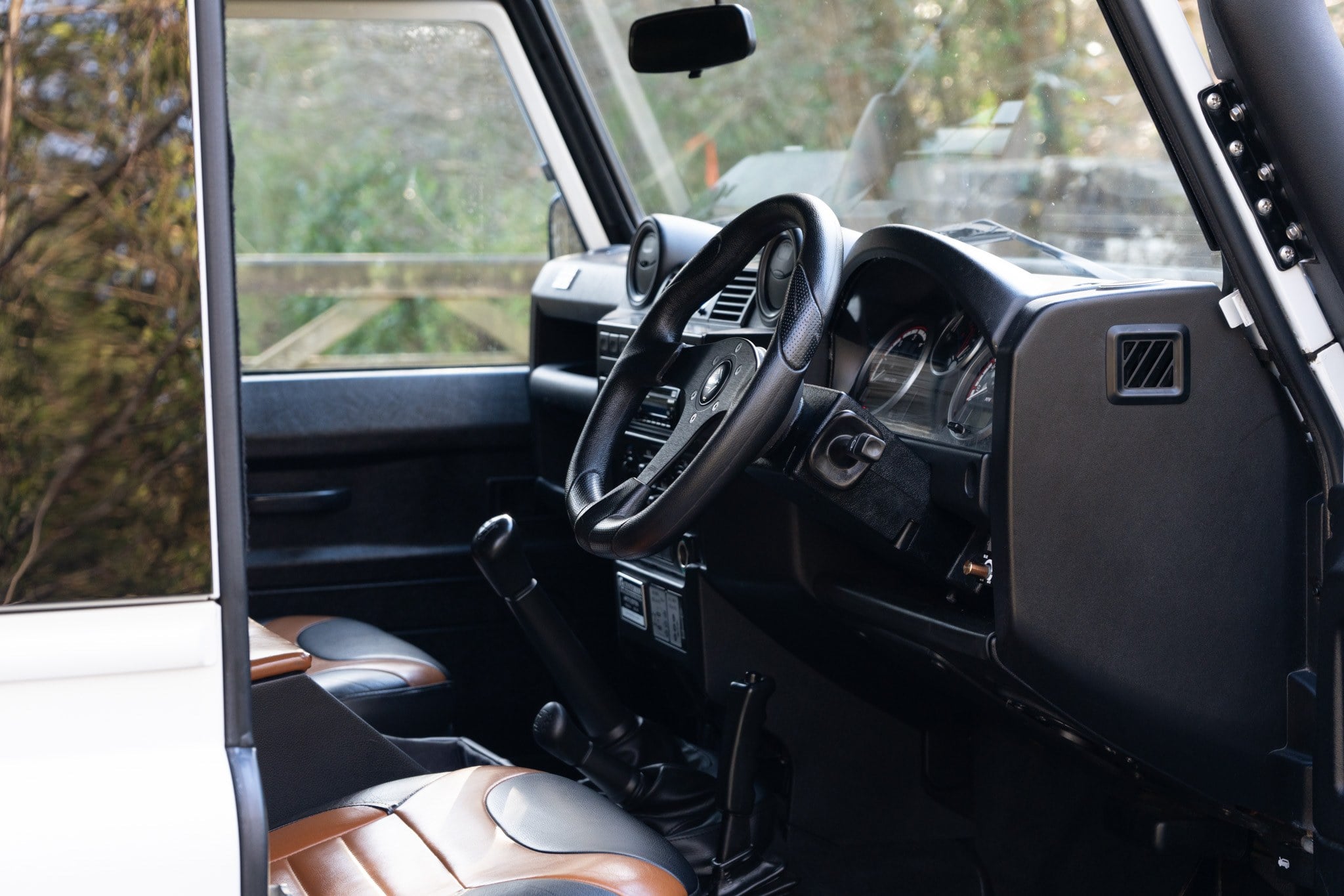 Naturalmente rifinito in bianco artico con finiture Santorini e vetri posteriori panoramici da limousine, questo Defender ha un aspetto perfetto. Il trucco per acquistare un Defender rialzato è quello di trovarne uno che abbia tutto il kit ma che non sia stato messo in funzione. In questo modo si ottengono tutti i vantaggi senza gli svantaggi del deterioramento dovuto all'uso. Questo esemplare è stato guidato, ma le sue condizioni indicano chiaramente che non è stato sottoposto a un duro lavoro.